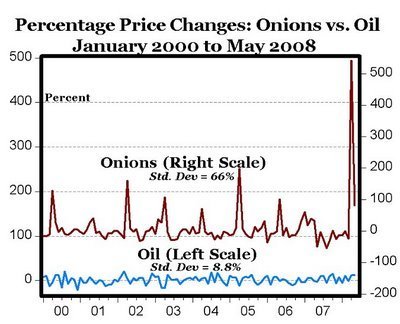 I think speculators get a bad rap and speculation is a stabilizing impact on commodity prices. The easiest illustration of this comes from the price of onions. Onion futures trading was banned in 1958 at the behest of then-congressman (later president) Gerald Ford who felt speculators were engaged in price manipulation. The result is that onions are one of the most unstable commodities out there:
