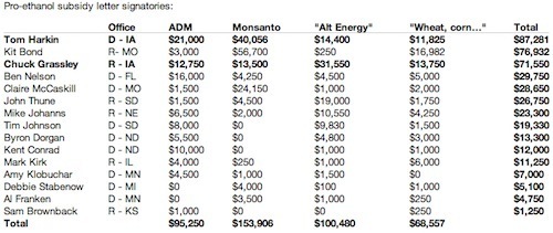 To me this seems like a terrible example to use if you want to persuade people of the corrupting influence of money. Look at Amy Klobuchar and Al Franken. They're not getting much of this special interest cash. And yet, they love ethanol. Presumably this is because of something having to do with Minnesota. The Senators from Iowa are soaking up corn cash, but that's not the reason they take a pro-corn line. They're pro-corn because corn is king in Iowa. Corn interests back Iowa politicians because it's in their interest for Iowa politicians to have as much clout as possible.