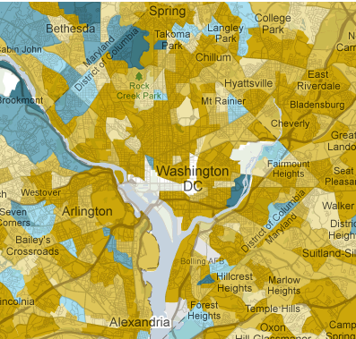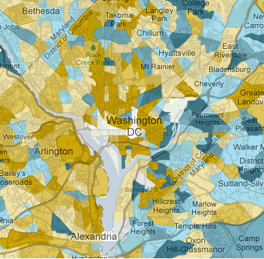 Lydia DePillis used the NYT's ACS Explorer tool to contrast the rise in DC median incomes with the sharper rise in median rents. Here's income: