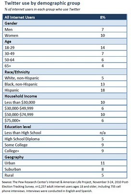 Interestingly, this is not your classic "early adopter" demographic heavily weighted toward white dudes. Instead, women and non-whites seem disproportionately interested. Personally, I love Twitter so for these purposes will classify myself as Hispanic in order to better fit the model.