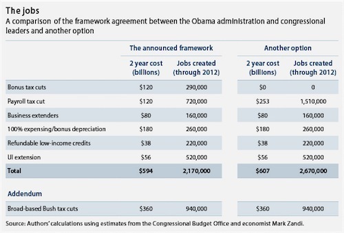 But of course nobody on the left is actually jumping for joy. Instead in the words of my colleagues Michael Ettlinger and Michael Linden we're at best saying that "[i]t is, however, unfortunate that these jobs have to come from an agreement that is a balance between large, unneeded, bonus tax breaks for the wealthiest Americans and the needed continuation of unemployment benefits, middle-class tax relief, and additional help for the economy for the rest of us."
