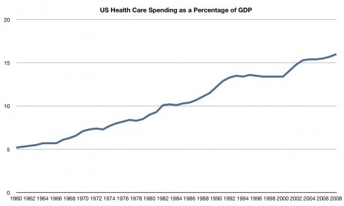 Aaron Carroll gives us an elegant chart of US healthcare spending as a share of GDP over time: