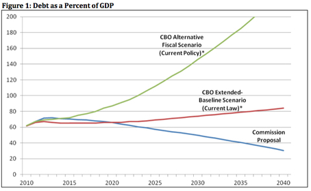 Obviously starting around 2020 or so Bowles-Simpson starts doing better than current law, but it's difficult for the current congress to tie the hands of future congress. After all, the whole point of the "alternative fiscal scenario" baseline is that past law doesn't bind the hands of the current congress. The AFS is preferred my many as more politically realistic than the current law baseline, which is fair enough. But wouldn't it be easier politically to stick with current law than to do Simpson-Bowles' huge series of unpopular changes? After all, the American political system has a ton of veto points. Barack Obama saying "I will veto any laws that increase the deficit relative to current law" would do more to reduce the debt over the next 2 or 6 years than would adopting Simpson-Bowles.