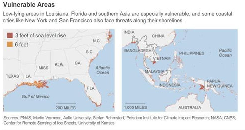 And the calculations suggest that the rise could conceivably exceed six feet, which would put thousands of square miles of the American coastline under water and would probably displace tens of millions of people in Asia.