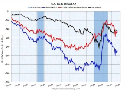 A government official emphasized to me today what should be clear to anyone who follows Calculated Risk's charts, namely that a huge element of our trade deficit has nothing to do with China or manufacturing but is instead driven by oil: