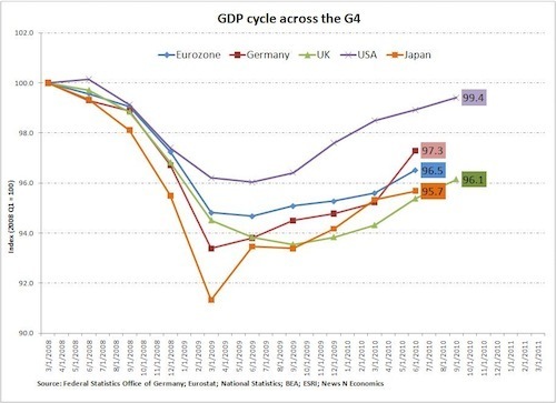 Germany is having more of a classic rebound recovery than we are (and their kurzarbeit plan worked pretty well to help people weather the storm), but it's from a much sharper downturn. And much of the rest of the EU is looking disastrous. When the single currency area was formed, skeptics warned that it would prove unworkable amidst this kind of crisis to yoke very dissimilar economies together into one monetary system. And as Ryan Avent observes there's little indication that the main Euro-area governments wants to take the steps that would be necessary to make the system work: