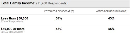 Now the median American household makes $50,222 so this vote split should generate a pretty even division of the electorate. But 63 percent of voters came from households with above-average incomes. In part that's because two-adult households are more common in the above-average bracket, in part that's because non-voting non-citizens are more common in the below-average bracket, and in part it's because high-income people turn out at higher rates.
