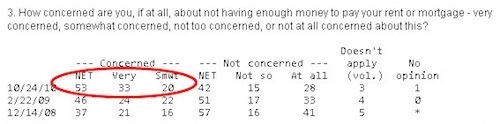I find data like this almost impossible to interpret. What's the baseline? Back in 2005 when the media wasn't interested in housing problems and nobody was polling this issue, how many people would have said they were worried about mortgage payments? How much do people say they're worried about things in general? How much more do people start worrying about their mortgage when you specifically start pestering them about it. I bet most Americans between the ages of 25 and 40, in practice, rarely worry about saving for retirement. But if you ask them about it then they'll start worrying. Right?