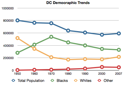It seems to me that by far the largest degree of black population decline happened during the 1970-2000 era when the white population was slowly falling from an already low level. It's true that the 2000-2007 period saw a small increase in the white population and a small further decline in the black population, but this "displacement" phase looks like a tiny blip in the scheme of things. The 2007 white population is about even with the 1970 white population, but the city contains about 100,000 fewer African-Americans than it did then. Those people aren't gone because anyone displaced them. I assume they're gone largely because declining housing discrimination made it much more possible for black people to move to the suburbs.
