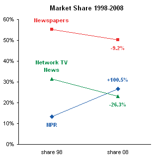 This tries to make it seem like eliminating federal funding to the Corporation for Public Broadcasting would have no impact on NPR listeners in New York or Chicago or Los Angeles or whatever other enclaves of decadent coastal liberalism you care to name. But if the only thing at issue were the availability of NPR programming in rural areas, the whole thing would be almost totally a non-issue. The point, however, is that not only do rural stations depend on CPB largess to keep broadcasting, but they kick some of that money back upstairs in fees to the producers of NPR (and PRI) shows. Thus, the CPB's subsidies to rural stations are, in part, subsidizing the creation of some of the programming that big city NPR listeners hear.