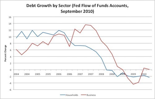 The fundamental issue here is that middle class households have no choice but to deleverage and pay down their debts. Business as a whole, by contrast, actually does have a choice. But if you think that future household deleveraging is going to make it hard to find customers for your goods then it doesn't make sense to go into debt to finance investments in expanding your activities. It also doesn't make sense for cash-rich firms (think Apple, Google) to spend their stockpiles down. The problem is that if businesses don't invest, then people don't have incomes, so paying down debt becomes even harder.