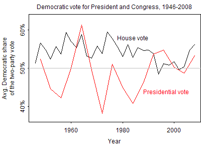 Ezra Klein mentioned this yesterday and I want to echo his view that the liberal insistence that Republicans are somehow "better at politics" perhaps because of their greater willingness to engage in "hardball" strikes me as pretty dubious. Over the past twenty years, Democrats have won three out of five Presidential elections and carried the popular vote in one of the two elections they lost. Democrats controlled the Senate from 1991-94, from 2001-2002, and from 2007-2010—just about half the time, with the GOP margin coming from the few months before Jim Jeffords switched parties. Democrats have also generally won more votes in the House of Representatives: