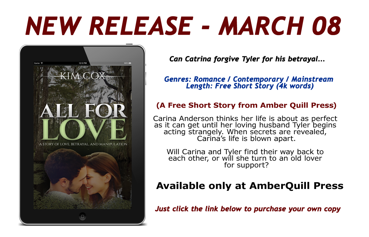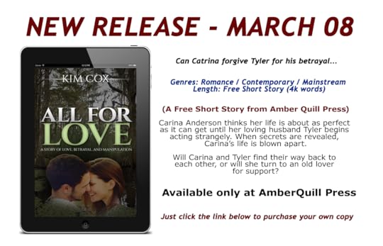 by Kim Cox, Kim Cox BooksDigital List Price: $0.99 - Regularly $1.99This is a sequel to All For Love.Release Date: May 18, 2015Carina and Tyler are finally back on track when Javier is up to his old tricks. He threatens them by playing on their fears and using their own love to turn them against each other.