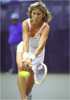 When the Virginia Slims women's tour came to town (imagine that! the quaintness of a sporting event organized to promote a tobacco product aimed at women--the logo was a willowy Jazz Age flapper with a chiffon scarf around her neck and a tennis racket resting insouciantly over a shoulder). This was the age of the wooden racket, and the age of Billie Jean King, Chrissie Evert, and Martina Navratilova. Oh, how great they were! Finesse, guts, and power. And we were watching so close (women's sports tours were a bust, the indoor stadiums largely empty throughout the days of practice and secondary matches) that we could feel the breeze from the swung racket against our cheeks.