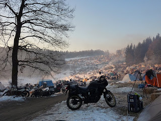 They come from all over. They've packed up to depart at first light. It might take them two or three days. There's that moment--crystalline, kept forever in the small jewel box of such images--when they take the last turn of a thousand, and then they have arrived. Spread before them is a sacred ground. The movable nation. The call of the rally is the motorcyclist's muezzin--the ritual call to prayer. It is what the summer is made for, unless you are truly hardcore. Unless difficulties make you smile, and party all the better. Unless you are up to camping in Bavaria in winter (left) at the Elefanten rally. Actually, this looks like a ton of fun to me.