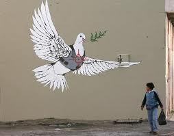 With pretty much everything sliding into the crapper--my personal life, London, the stock market, and new power to the Tea Party front for the corporate interests that won't stop until they've sucked us dry like the world's freaking biggest mosquito, the government having run out of repellent--it didn't look like there was any bright spot anywhere in my vicinity. Until my son and I leaned back last night and gave ourselves up to a film.Last Christmas I had gravely disconcerted him. We needed something new for the top of the tree. When I stumbled on the image of the dove of peace, above--sporting flak vest and a laser target on his chest--I knew I'd found the perfect thing. So Today. (Unfortunately, also so Yesterday and Tomorrow.) I printed it and tied it on with a silk ribbon. I then had my very own Banksy for the tree; my son, thankfully not yet attuned to the sad ironies of the grownup world, was disturbed. I told him I found it oddly hopeful: at least someone was watching, and speaking the truth. With the keen succinctness of art.