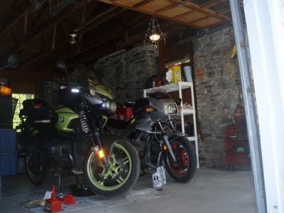 No, we're going to the Girl Cave, where we can escape into a world of relative order (admittedly because there is simply less stuff than in the main house) and where there's supposed to be dirt, so we don't ever feel a duty-shirker here. Some kitty litter on the oil stains, a quick broom, et voila. Peace, quiet, and motorcycles. Oh, and whatever's playing on the college radio station. It comes in on the radio in the Girl Cave, though not in the house. Magic, eh?