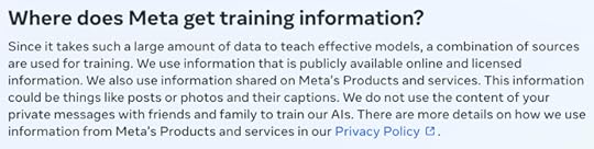 Users in the UK and European Union are allowed to opt out of the generative AI thanks to the General Data Protection Regulations (GDPR). We in the United States need the same protections offered by GDPR. It is absolutely unacceptable that we are seeing a repeat of Cambridge Analytica, this time with our intellectual property. It’s clearly not enough that Mark Zuckerberg shows us ads. He has to steal our memories, too, all so that he can imitate us with his products. It is presumptive and hubristic that he declares generative AI is “good for humanity.” It’s only good for his bank account.