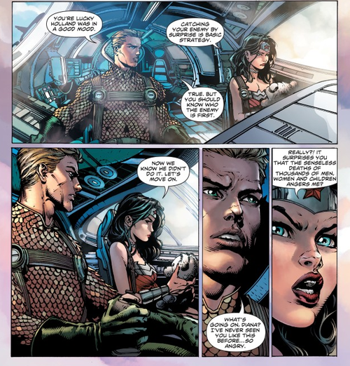 Drowning in guilt, Wonder Woman decides to go have a cuppa cawfee in some café with her bestie. Yes, the God of War, Queen of the Amazons, and Justice League member is getting some advice with her caffeine fix. Her friend warns her that she’ll “become Ares — violent and dangerous.”