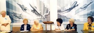 Monday evening, after two trips to the airport to meet arriving flights, we congregated in the hotel lounge. The six WAFS— Nancy Batson Crews, BJ Erickson London, Teresa James Martin, Gertrude Meserve Tubbs LeValley, Barbara Poole Shoemaker and Florene Miller Watson — totally captivated the serving staff and the young men and women—new employees because the hotel was newly opened—fought for the opportunity to bring them drinks and food and then hung around for conversation.