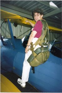 He helped me buckle into a WWII vintage parachute. It was so heavy it almost pulled me over backwards. I set my shoulders against its weight. I’m not sure I could have pulled that ripcord, but I suppose if my life depended on it I would have found the strength and leverage. I climbed into the front seat. Dr. Jim handed me earphones and helped me adjust them. “So I can talk to you,” he said. Then he helped me fasten and check the safety harness. I was in. I was ready.