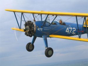 hangar waiting for us, and there stood the blue and yellow, open cockpit Stearman. I climbed up on the lower wing, stepped down into the front seat and checked out the cockpit. Stearman Flight, here I come!