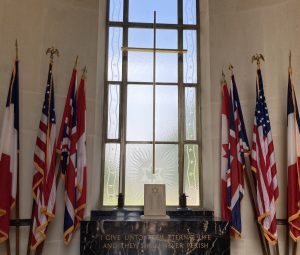 “In grateful memory of her sons who gave their lives in the landings on the Normandy Beaches and in the liberation of Northern France. Their graves are the permanent and visible symbol of their heroic devotion and their sacrifice in the common cause of humanity.”These words grace the altar: