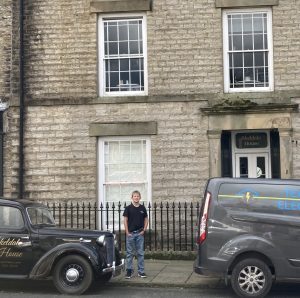 Grandson Daniel in Front of Skeldale HouseThen on to the crown jewel! Skeldale House right across the street in Thirsk.