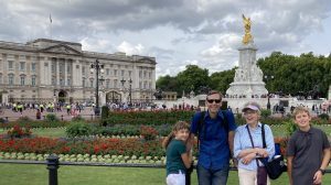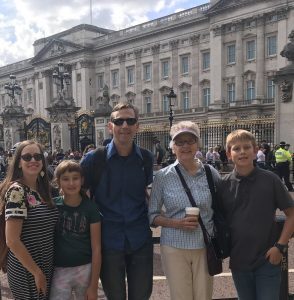 Emy, Jim, Sarah and Daniel at Buckingham PalaceA full day for the Rickman Five: the Tube into downtown London deposited us near Buckingham Palace, a popular place at 11 a.m. that morning. We were there to witness the Changing of the Guard – we and several thousand other tourists. Again the “babble” of languages. I wonder if this is what the Tower of Babel was like – back in the day?