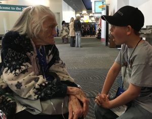 WASP Millie Young talks with Sarah’s grandson, Daniel, at Women in Aviation, Reno, 2018.