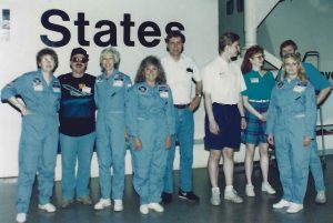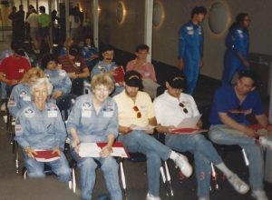 Our team — five women and four men (See photo) — went through simulated “space-flight” exercises in a “space vehicle.” We were treated to movies in 3-D — or was it Surround Sound? Meals in the mess hall. We slept on bunks in dorms. I remember Wally claimed the upper bunk before I could. It reminded me of being at camp when I was a teenager. In fact for three days, we were teenagers again!