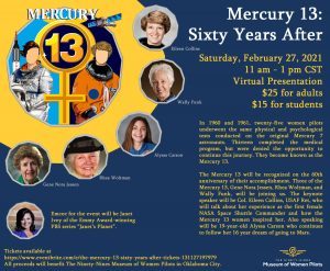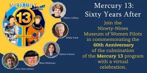 Tomorrow morning, February 27, fans of the Mercury 13 will meet, VIRTUALLY, to celebrate their 60th anniversary! — 11 am to 1 pm Central Time. Those in the other three time zones need to adjust accordingly. The celebration is courtesy of the Ninety-Nines Museum of Women Pilots (MWP), located in Oklahoma City. Proceeds from the ticket sales go to support the WMP.