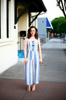 Blue, white, stripes--some of my favorite elements this summer! I found the coolest blue and white stripe linen blend from Fabric.com and made this very summery, dramatic fitted jumpsuit!