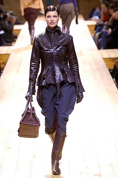 Jean Paul Gaultier for Hermès Winter 2004/05 Collection. Worn with Kelly boots and Birkin bag by Linda Evangelista. Jacket approximately $145,000