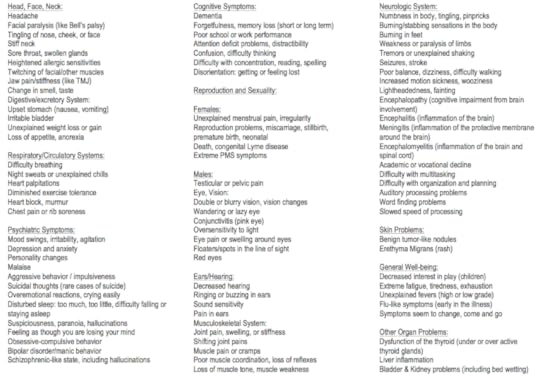 The symptoms of Lyme Disease vary but most people struggle from many of the following symptoms: debilitating fatigue, heart issues, heart palpitations, arthritis, facial numbness, blood pressure problems, extreme pain, autoimmune disorders, malnutrition, hair loss, vision problems, skin issues, rashes, panic attacks, adrenal failure (or fatigue), memory issues, food allergies, unexplained allergic reactions, insomnia, inability to absorb vitamins and nutrition, hormonal issues, circulation issues, dizziness, seizures, body numbness, blindness, migraines, paralysis in extremities, heart attacks, inability to handle temperature change, lung function, shortness of breath, menstrual issues, and the list goes on and on and on. I have just listed a few but here are hundreds more.
