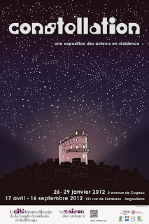 Todos los años, para el Festival de Angoulême la Maison des Auteurs prepara una muestra de los autores en residencia durante los últimos doce meses. Este año el concepto con el que se ha curado la muestra es "Constelación" y el afiche ha sido ilustrado por el gran dibujante y experto tocador de banjo (¿banjista?), el zaragozano Álvaro Ortiz. Además de los trabajos de Lucas y Álvaro, la muestra se completa con las obras de Mi-young Baek, Paul Burckel, Lorenzo Chiavini, Laure Clémansaud, Robin Cousin, Rachel Deville, Elric Dufau, Elsa Fanton d'Andon, Elena Forcato, Cédric Fortier, Claire Fouquet, Pascal Girard, Thomas Gosselin et François Henninger, Jean-Luc Gréco, Céline Guichard, Benoît Hamet, Jung-hyoun Lee, Tigran Mangassarian, Julie Maroh, Bearboz, Camille Moulin-Dupré, Emre Orhun, Yoon-sun Park, Nathan Schreiber, Julien Zanesi. Muchos de ellos fueron nuestros compañeros de residencia. A todos un gran saludo desde estas pampas. Nos encantaría haber estado ahí, en esa ciudad donde la pasamos tan bien durante cuatro meses. Pero bueno, de alguna manera, estuvimos.D.