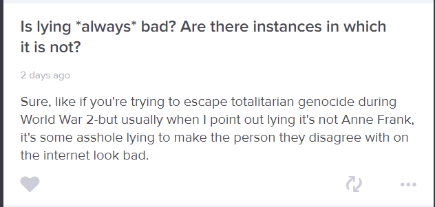 You are responsible for faking the identity of someone you hate online. You are a liar. I will remind you of your own very often repeated advice on lying;