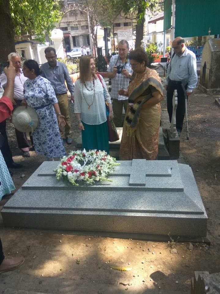 Receiving FW Stevens' descendant Diana Robertson and Kevin at the Taj, alongwith Anita Rane-KothareHe was only 52 when he died of malaria at his home in the Malabar Hills in 1900, and was buried in Sewri Christian Cemetery, where his grave carries the inscription, "In loving memory of Frederick William Stevens, born May 11th 1847, died March 3rd 1900." Diana also broke down at the cemetary during the visit on April 20, 2017. A few photographs.