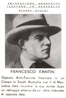 In the 1930s, Fantin had moved to Victoria, where he becameactive in the Labour and anti-fascist movements. He became a correspondent forthe anti-fascist newspaper La Risoccossa. Fantin was arrested byAustralian authorities in 1940 as a fascist. He appealed the decision, butlost, and was sent to Loveday Internment Camp 14A at Barmera. Unlike otherinternment camps, Loveday separated internees by nationality, not politicalaffiliation, which led to a political divide between those detained. Fantinstood with the anti-fascist, and became a political leader, which led toconstant harassment, abuse, and assault from fascist detainees. Anotherdetainee entered Fantins tent and beat him senseless. Fantin reported theassault, but the authorities would not get involved.