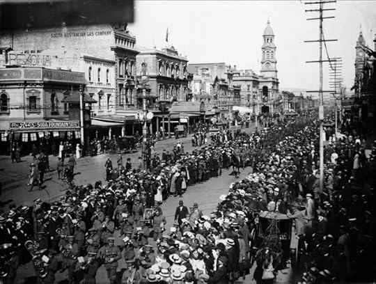 "The parade was a triumph of faith, hope and loyalty - faith in the strength of British arms, hope of a speedy peace, and loyalty which can never give enough for King and country. The city was transformed. North Terrace and King William Street presented a picture of seething humanity which will not readily be forgotten. For fully two hours before the parade trains and trams were pouring people into the city. There was no open roadway to be seen from Victoria square to the Adelaide Railway Station. The (parade) route was in a northerly direction from West terrace to North terrace, thence to Pultney street along Rundle, King William, and Grote streets, passing the Queen's statue".