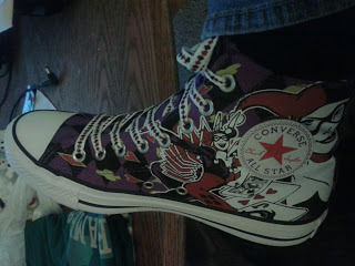 If you were unaware, I am a huge Batman fan. Love him! I have a enormous collection of book, graphic novels, art, and figures. Within my love of Batman is a strange adoration of Harley Quinn. She's the Joker's sidekick, former psychiatrist Harleen Quinzel. I love her perky, twisted sense of humor. I love her blind love of the Joker. While I'm not fond of the way she's sometimes his punching bag, I am happy to see that she occasionally snaps back at him. They are the new definition of a "healthy relationship". So you can understand why I was so thrilled to pick up my new shoes. I am fighting the temptation right now to go back and pick up the other pair of Batman shoes as well as the Thundercats shoes -- the CLASSIC THUNDERCATS. These are also my first pair of Chucks and I'm loving them.