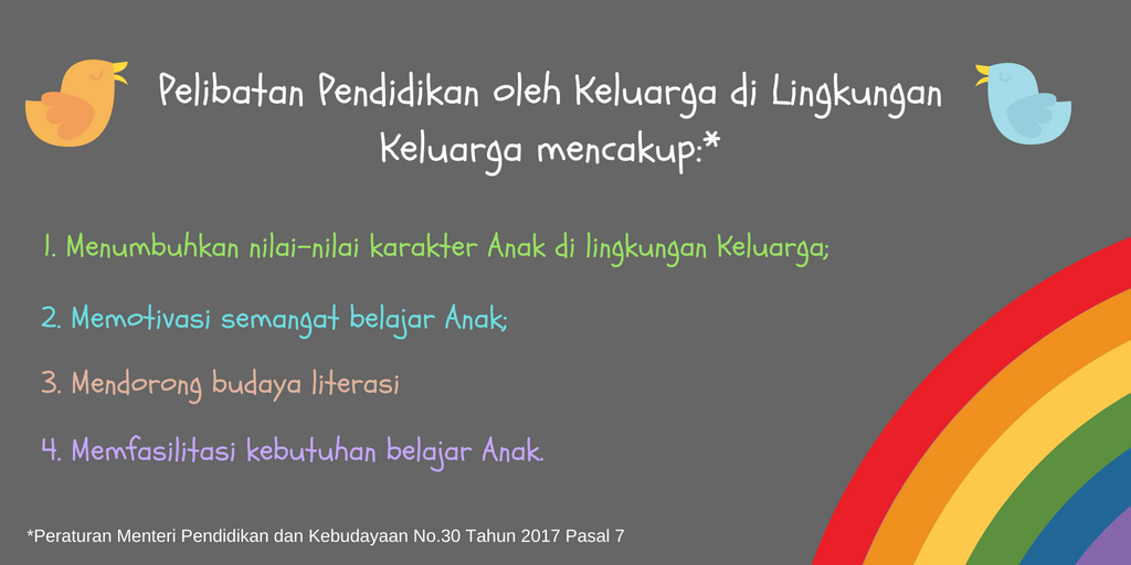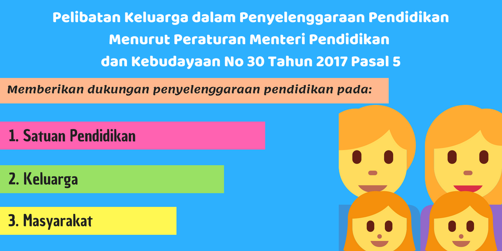 Ada yang tahu Kementerian Pendidikan dan Kebudayaan melalui Peraturan Menteri Pendidikan dan Kebudayaan nomor 30 tahun 2017 , lagi gencar-gencarnya mengampanyekan pelibatan keluarga pada penyelenggaraan pendidikan anak-anak Indonesia? Eits, jangan pusing dulu membaca peraturan karena peraturan ini dibuat demi kebaikan kita bersama. Lalu kenapa sih keluarga harus terlibat? Kan di sekolah juga anak-anak udah belajar, yang ngajar juga orang-orang profesional. Bu-Ibu, Bapak-Bapak, Teteh, dan Akang. Pasti ingat kalau anak mendapatkan ilmu pertama kali dari keluarga, atau yang lebih tepat dari orangtuanya sendiri. Keluarga memang punya andil yang besar untuk pendidikan anak-anaknya dari mereka lahir hingga saat mereka siap terjun mengabdi ke masyarakat. Pelibatan keluarga dalam pendidikan di Indonesia menurut Peraturan Menteri No 30 Tahun 2017 yang lebih lengkapnya bisa diunduh di sini . Kalau kita baca sekilas, pelibatan keluarga dalam penyelenggaraan pendidikan menurut Peraturan Menteri Kementerian Pendidikan dan Kebudayaan No 30 Tahun 2017 di pasal 5, bunyinya seperti ini, memberikan dukungan penyelenggaraan pendidikan pada Satuan Pendidikan, Keluarga, dan Masyarakat.