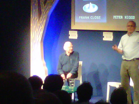 It's not every day you get to shake hands with someone whose name will be remembered on the starships. Today I did, unexpectedly. Participants in the Edinburgh International Book Festival can choose up to ten free tickets. One of mine was for Frank Close on his new book The Infinity Puzzle, about the search for the Higgs Boson. I sat down in the packed-out Scottish Power Theatre tent, and saw on the screen that the event was to be chaired by Peter Higgs.