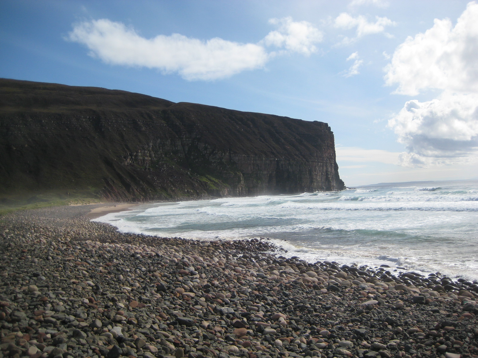 That talk was sponsored by Loganair, who covered my (and Carol's) return flights. Never having visted Orkney before, we were grateful for the opportunity to do a bit of exploring around the islands as well as attending events. Orkney is a place where history and prehistory are scattered liberally over the landscape, from the neolithic village of Skara Brae to the rusting guns recovered from Scapa Flow. The land is mostly low, undulating, and green, with the horizon sometimes just yards away, as you were if on the surface of an improbably terraformed asteroid. Underlying it is sedimentary rock, megayears of Devonian deposition exposed on every cliff-face and rocky shore, and the spoil-heaps left by the ice piled in heathery knolls at the foot of glens. Having all this pointed out to us, on a tour of Hoy with geologist Dr John Flett Brown (you can see him in very characteristic action here) was one highlight of a memorable and enjoyable week.