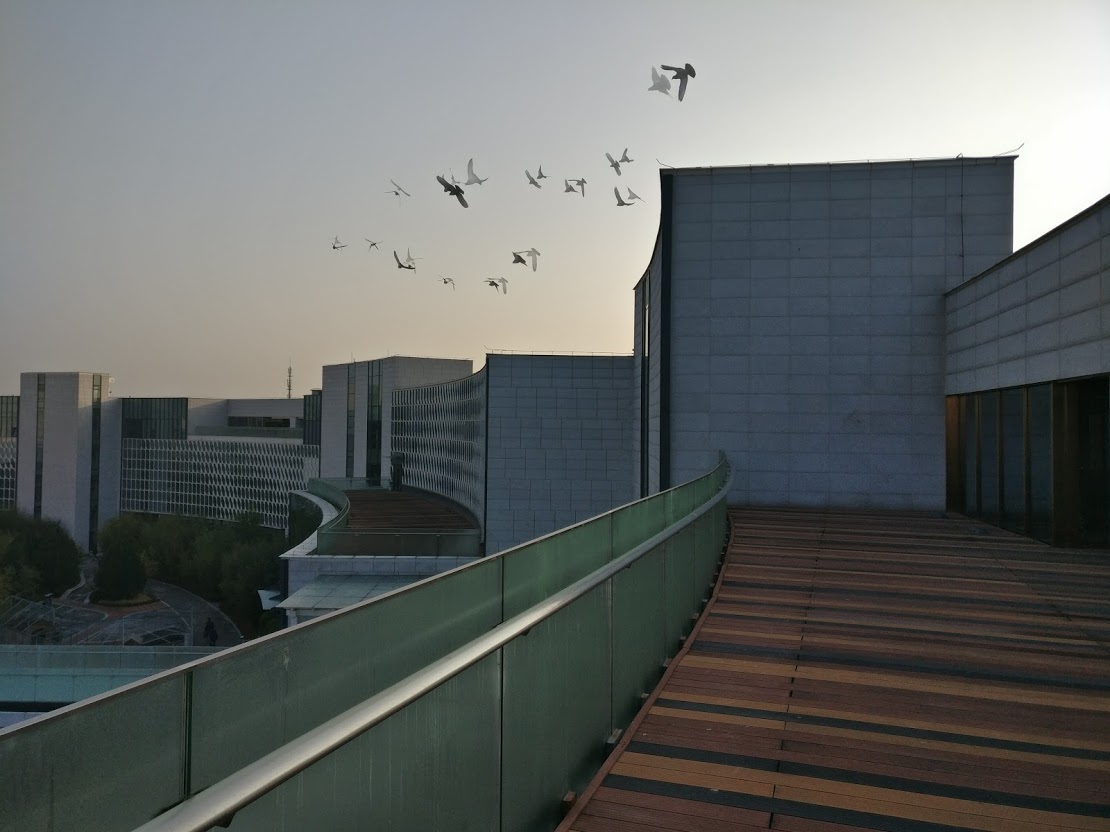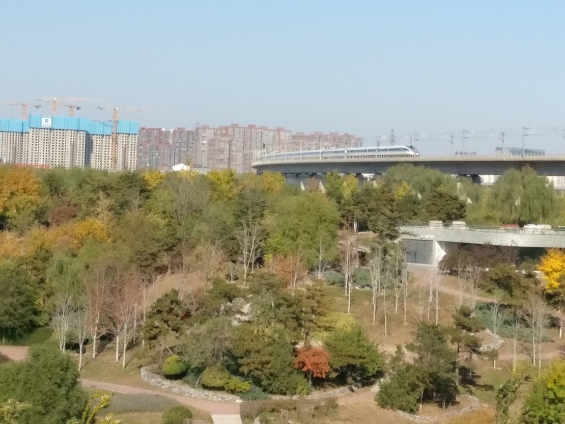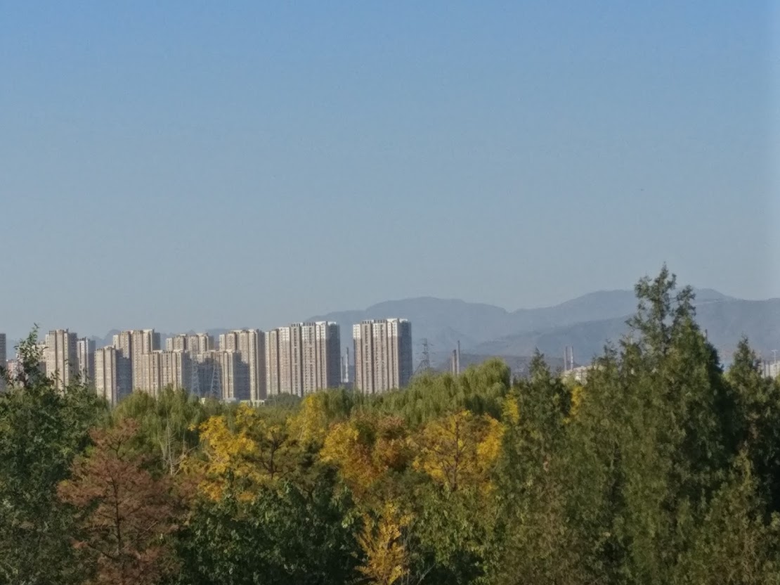 On we wandered, into a Garden Valley built over an old landfill site, past some fish and lily ponds to a viewing platform high above. The approach was by a ramp so wide and long it was like walking into the sky. From there we looked out over Beijing. The city has a few skyscrapers, a CBD cluster, and lots and lots and lots of high-rise apartment blocks. It was a fine day with only a slight haze, and we noticed a zigzag line across the distant hills. The Great Wall!