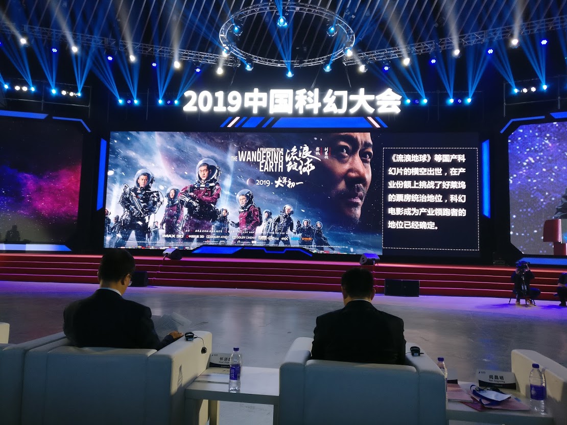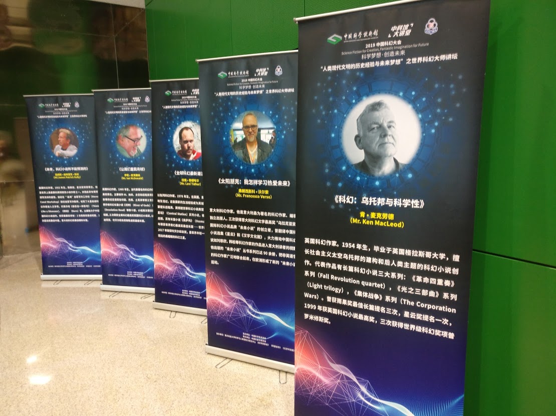 The group I was in included Francesco Verso, Tullio Avoledo, Robert J Sawyer, Lavie Tidhar, James Patrick Kelly, and Ian McDonald. Other writers from overseas, who spoke on other tracks or in the opening ceremony, included Kevin J. Anderson, Mary Robinette Kowal and Russell Davis. We were only a small part of the convention, which featured many high-profile Chinese SF writers and scholars including Hugo winners Liu Cixin and Hao Jinfang, internationally active fans such as Carolina Gomez Lagerlöf, Crystal Huff and Vincent Docherty, as well as presentations and exhibitions from the media and tech industries. Altogether there were at least a thousand fans in attendance, and the convention was well covered by the Chinese media.