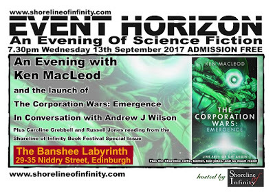 Next Wednesday, 13th September, Edinburgh's monthly SF mini-festival Event Horizon is doing me the honour of launching my forthcoming novel The Corporation Wars: Emergence (available for pre-order here). By special courtesy of the publishers, advance copies will be on sale at the event. Caroline Grebbell and Russell Jones will kick off proceedings, followed by a conversation between me and Andrew J. Wilson, author, reviewer, and stalwart of the spoken word scene.