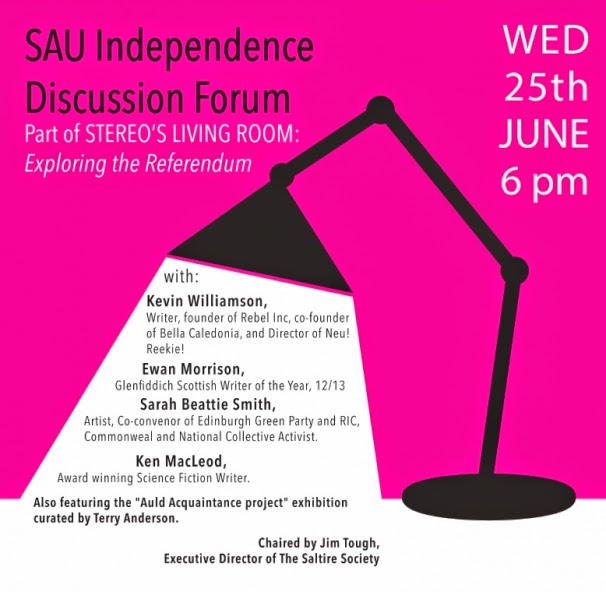 The debate on Wednesday night went well. The venue was friendly, informal, hospitable and efficient. The Scottish Artists Union, which hosted the discussion, drew an engaged audience of its own members and others. Jim Tough of the Saltire Society chaired with a firm but easy hand. The other participants -- Sarah Beattie-Smith and Kevin Williamson for Yes, and Ewan Morrison for (I think) Undecided-edging-towards-No -- put their points across sharply. No punches were pulled, and despite or perhaps because of that everyone stayed friendly and civilised -- we had a good conversation afterwards at the bar at the back. I like and respect all the other participants, all of whom I've met before -- which, I suggest below, is part of the problem with independence, but there you go.