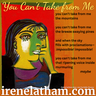 No doubt it's from that space where this week's ArtSpeak: PICASSO poem started. The portrait is of one of Picasso's mistresses, Dora Maar. Picasso sees what he sees, but what's she thinking, really? She may be sad, but she also looks like a woman who may be thinking of ways to save herself.