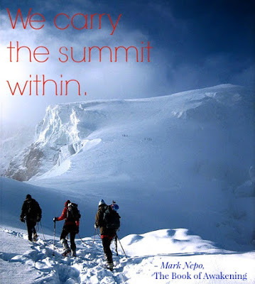 "Despite all our noble efforts to reach some treasured peak -- be it a dream of wealth or love -- we carry the summit within. And it is always the effort and exhaustion -- the very journey itself -- that opens the view which is everywhere. For the summit is not so much arrived at as we are worn open to it." - Mark Nepo